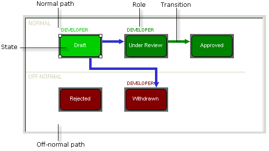 The following diagram illustrates a simple item lifecycle for a document. Only a user with the Developer role can action the object from DRAFT to UNDER REVIEW, while only a user with the Team Leader role can action it from UNDER REVIEW to APPROVED. Although not shown in this example, note that you can assign more than one role to a transition.