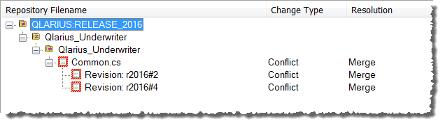 If you automatically merge non-conflicting file conflicts, the change tree on the Review Changes page of the Merge wizard looks similar to this: